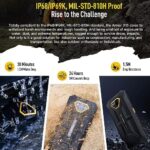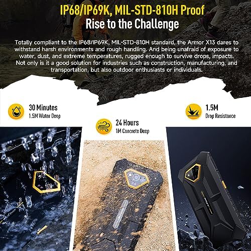 Proof Totally compliant to the IP68/IP69K, MIL-STD-810H standard, the Armor X13 dares to withstand harsh environments and rough handling. And being unafraid of exposure to water, dust, and extreme temperatures, rugged enough to survive drops, impacts. Not only is it a good solution for industries such as construction, manufacturing, and transportation, but also outdoor enthusiasts or individuals.