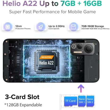 7GB RAM &16GB ROM UNLOCKED PHONE: Note 14 unlocked phone is based on a 12nm production process, MediaTek Helio A22 processor, up to 2.0GHz, which can ensure the more stable and more smooth experience. With 3GB RAM, also a 4GB RAM virtual memory can be activate additionally to get total 7GB RAM and 16GB ROM, also can expand to 128GB by adding a TF Card. PS: please firstly upgrade the system, then go to “Settings–》Intelligent assistance–》MemFusion” to get more 4GB RAM virtual memory.
