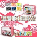 【Instant image camera for children】this kids toy camera support 12 megapixel photo shooting and 1080p HD video, 2.4 inch IPS screen. The children’s camera supports original photography, video recording, reproduction, burst recording, 5 classic filters, 8 special effect, 20 cute cartoon frames, 19 language available.