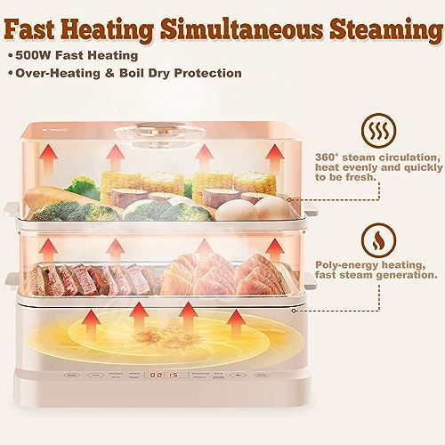 【Food Grade Material, Easy to Store】The electric steamer is made of high quality food grade material and is BPA free. The steam trays and its holder are installable and detachable, which is easy to clean. Nested storage and fits neatly in the kitchen cabinet, it does not take up much space, which brings convenience to kitchens in small spaces.