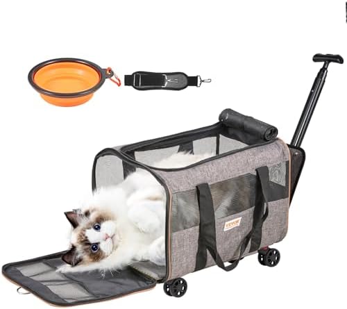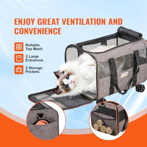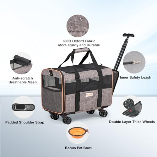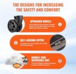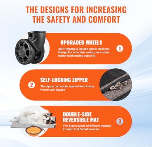 UPGRADED WHEELS DESIGN: VEVOR rolling dog carrier wheels are improved. It not only is 360° rotating smoothly, but more importantly it features double-layered, thickened and wear-resistant design with a 2.3-inch diameter. It will be more durable and quieter. It ensures a bump-free journey on various road surfaces for your pet.