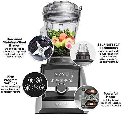 Our most advanced blender is now available with a versatile, 48-ounce container that makes smaller to mid-sized blends a breeze. The A3500 features 5 program settings (for Smoothies, Hot Soups, Dips & Spreads, Frozen Desserts, and Self-Cleaning) that automatically adjust to your container size, process your recipes, and stop the blender when complete. Touchscreen controls are easily wiped clean, and a programmable built-in timer helps you achieve your perfect blend, every time. Create a personalized blending system by pairing the Ascent Series A3500 with a range of compatible containers and attachments. This blender can replace these 11 kitchen tools: Stand Mixer, Hand Blender, Meat Grinder, Spice Grinder, Ice Cream Maker, Baby Food Maker, Food Processor, Juicer, Chopper, Knife, Mortar and Pestle. Industry leading warranty – up to 10 years based on a survey of competitive warranties as of August 2022.