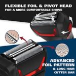 Advanced foil technology – flexible foils move with you, providing a more comfortable shave, our advanced foil pattern provides smooth shaves & Features a long hair cutter bar as well as a full-size pop-up precision Trimmer detailer