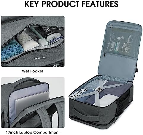 【WET POCKET & LAPTOP COMPARTMENT】The wet pocket for toiletries, made from high-density waterproof material, can help you store wet or damp items such as toothbrushes, razors, and shampoo bottles. The separate laptop compartment can accommodate laptops up to 17 inches, perfect for your work or study needs in companies and universities.