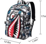 【Large Capacity】Novelty shark backpack size is 17*12.6*7.09IN. Enough to accommodate all the supplies or daily necessities needed by children .1 Main Bag with 1 Computer Compartment Bag,Laptop compartment fits up to 16 inch laptop; 2 Front Zipper Pocket; 2 Side Pockets. Reasonable design and spacious capacity can meets your daily use.Suitable for age 5+