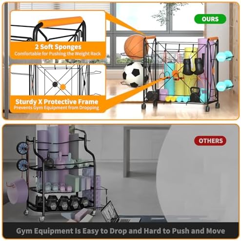 【Lockable Wheels & Removeable Hooks】: The home gym storage organizer comes with 4 heavy duty 360° wheels (2 lockable) and 2 sponges on handles. It is easy and comfortable to move the storage rack anywhere you want and lock it in placement. Besides, there are 3 removable hooks on the front for hanging towels, resistance bands, yoga wheels and more.