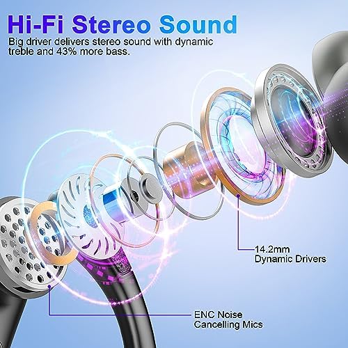 Superior Sound Quality and Clear Call: Wireless headphones have strong 14.2mm speakers driving units and in ear acoustic structure support, which produces a strong bass, clear mid sound, and bright treble. Noise cancelling earbud feature noise-canceling calls, effectively reducing background noise, creating a stable and clearer calling environment like you are communicating face to face with others.
