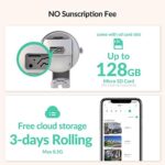 【All in one camera】This wireless camera outdoor camera,with free 3-days playback,video saved in cloud server(Max 0.5GB). Support max 128G (SD card not included).You could 2-way talk, playback,motioin detection,rotate angle,even when outside
