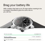 “30 DAY RECHARGEABLE BATTERY LIFE – Up to 30 days with normal use. +20 additional days in power reserve mode (time and activity tracking only). Charging Cable incl.”