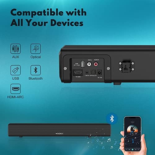 Super-Easy Setup: supports a variety of connection mediums, such as HDMI-ARC, wireless Bluetooth, optical, AUX, line-in, and USB input, making it compatible with almost all your devices including TVs, phones, PCs, gaming consoles, projectors, and laptops.