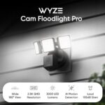 Wyze Cam Floodlight Pro combines a 180° wide-angle lens and 2.5K QHD video so you can see your yard end-to-end in more detail than ever. It relies on evolutionary onboard AI computer vision to detect motion and turns on the adjustable 3,000 lumen LED lights only from objects you select, like people and vehicles. In other words, we created a high-powered security camera with bright lights that thinks and responds like a personal home security guard—no donuts required.