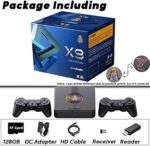 🎮Package Including: 1xGame Console X9, 2xController, 1xReceiver, 1x128GB TF-card(or in console), 1xCard Reader, 1xHD Cable, 1xDC Adapter, 1xInstructions.