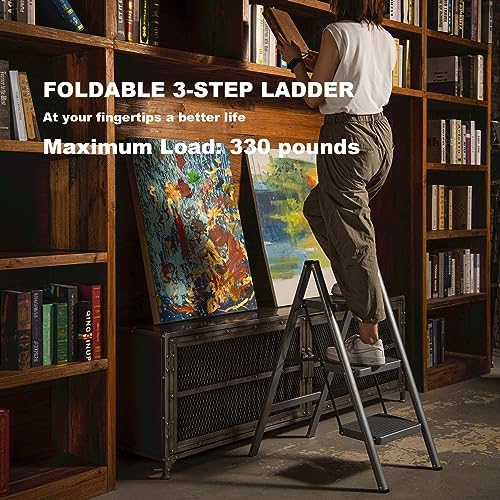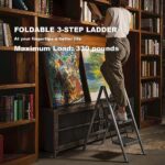 【SIZE OF STEP LADDER】Open: 25.77″ L×16.34″ W×32.87″ H. Folded: 16.53″ L×1.97″ W×35.43″ H. Net Weight: 9.9 pounds, Maximum Load: 330 pounds. Our convenient and multi-use 3-step ladder is perfect for little height in the home, office, bathroom, or garage.