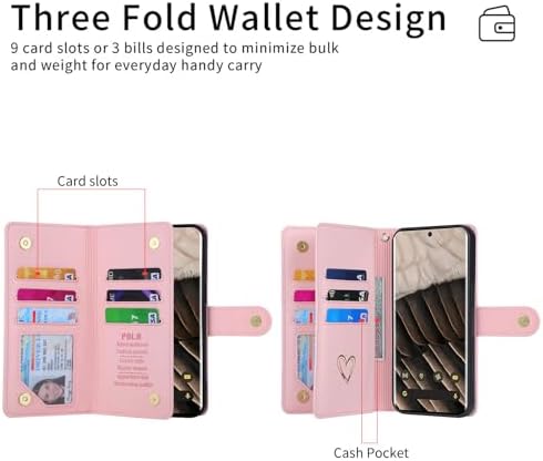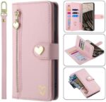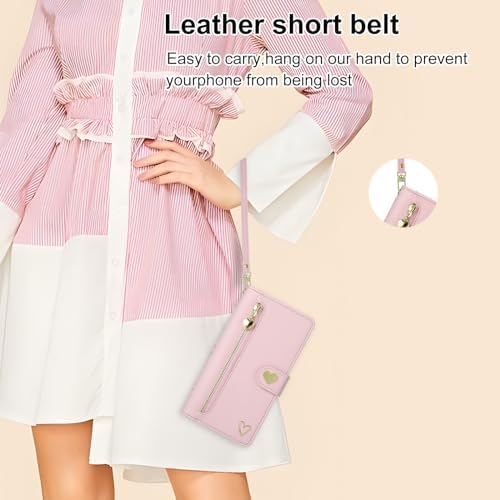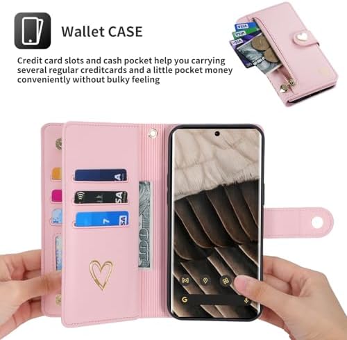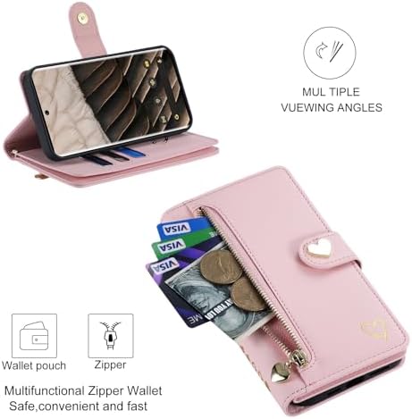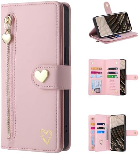 XYX Wallet Case for Oppo A55 5G, Gold Love Pattern PU Leather 9 Card Slots Flip Leather Zipper Pocket Purse Cover with Wrist Lanyard for Oppo A55 5G, Pink