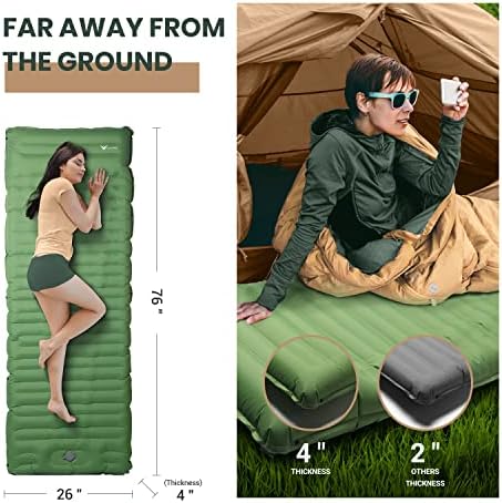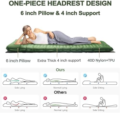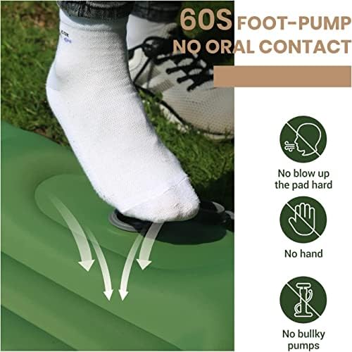🏆【Built-in foot pump】: No mouthpiece, no extra pump, the Yeakyard wide sleeping pad comes with a built-in foot pump. This thick, large sleeping pad takes just 1 minutes to fully inflate, no mouth, no hands, and it’s hygienic enough that even a child can do it. Two double-layer valves on the pillow effectively prevent air leaks and allow for quick deflation, just remember to close the valve before inflating. NOTE: Inflation time depends on how fast you pedal.