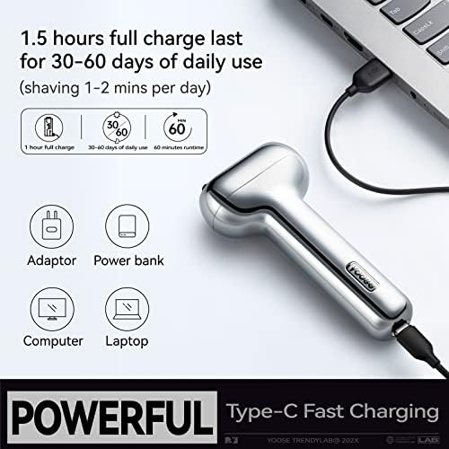 【Long-Lasting, 2 Speed】 The yoose shaver is equipped with a 700 mAh lithium battery and a Type-C charging port. With 1-2 minutes of shaving per day, the power can last about 30-60 days. 60 mins of cordless shaving time on a full (1.5 hour) charge. Dual-speed free switch, soft mode to enjoy a gentle shave, powerful mode for an efficient clean shave. Press the power button for three seconds to enter the safety travel lock mode to prevent accidental touch.