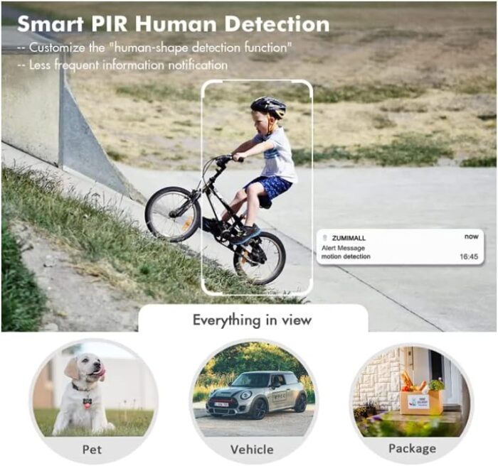【AI Detection & Real-time Alerts 】- Home security camera using the latest AI algorithm and PIR sensor that can identify person, pet, vehicle, and parcel, support set alarm plans, and adjust sensitivity levels to minimize false alarms. Once motion detection is triggered, a notification will be sent to your mobile APP and the video or image will be stored in the SD card or cloud storage so that users can more accurately capture the content they care about in real-time.